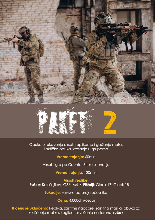 Izaberite paket koji vam najviše odgovara ili iskombinujte više paketa iz naše ponude. Paketi su podeljeni u tri grupe: Airsoft, Adventure i Poligon.