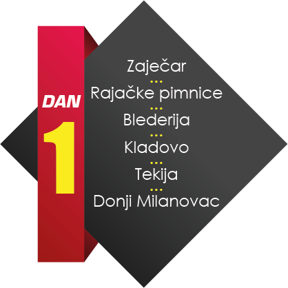 Okupljanje i početak naše avanture na dva točka je u gradu Zaječaru, domaćinu Gitarijade, najstarijeg rok festivala u Srbiji. Prvi deo puta, od oko 60km nas vodi do sela Rajac i do poznatih Rajačkih pimnica. Pimnice su, zapravo, naselje napravljeno za proizvodnju i skladištenje vina. Naravno, u pimnicama ćemo i da probamo po neko vino domaćih proizvođača...ali ne previše, jer nas put tek očekuje ;) Nakon ovog, Dionisovog iskustva nastavljamo put kroz istočnu Srbiju sve do vodopada Blederija, skrivenog u oazi prirode i mira. Sledeća stanica nam je obala Dunava i Kladovo.